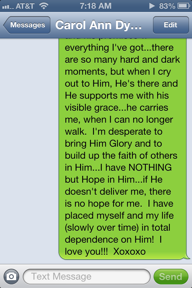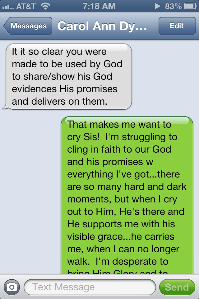 February 16, 2013 Texts between me and Carol Ann Dykes, a former vendor to Keri and I, who became one of my dearest friends.