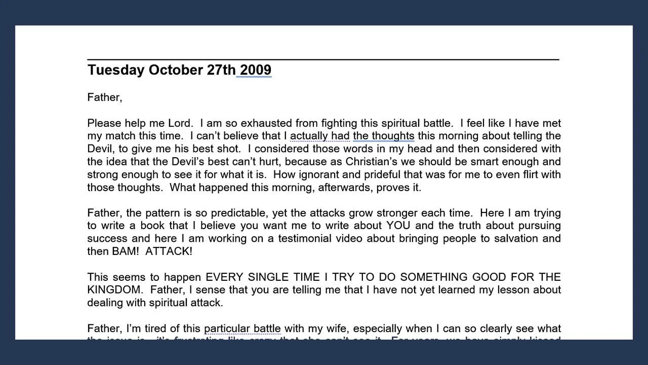 Three days before I gave a total abandonment of my life to the Lord, I poured out my exhaustion from the suffering in my marriage, to the Lord, and then I journaled my heart to the Lord the day before I gave it all up to Him.