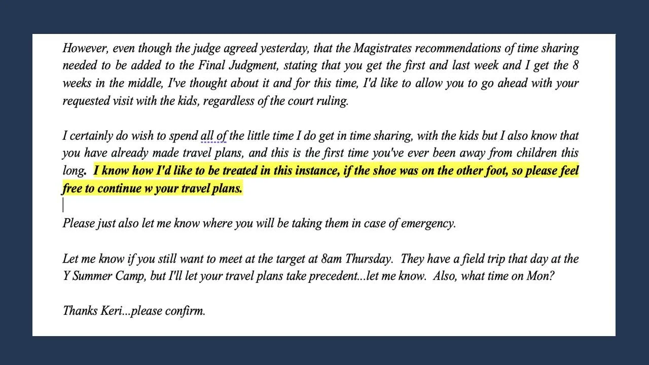 I had prayed for ways to be able to do good to Keri, and then God opened the door in a way I didn’t expect. Keri’s attorney, Abigail Johnston, had successfully manipulated the proposed final divorce decree at this point, to include allowing Keri three visits with the children, during my Summer-time visitation. Here was my opportunity.